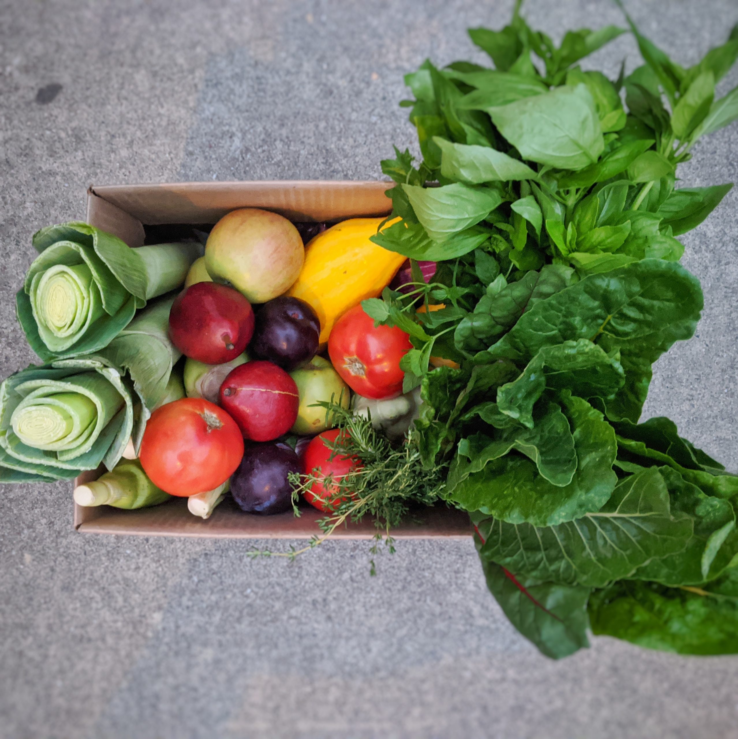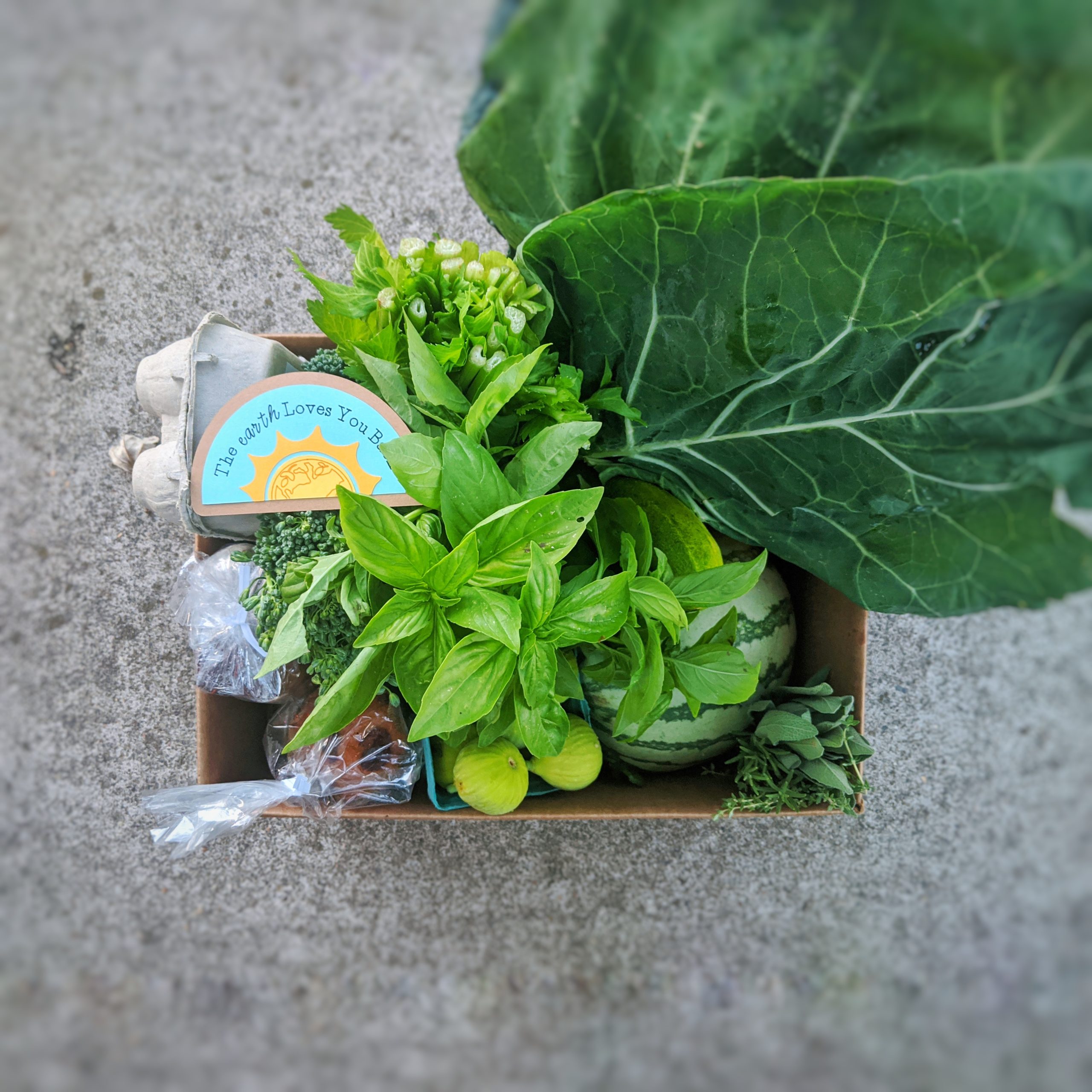 Each Bounty Box includes gifts from Mother Earth such as: freshly baked ​breakfast pastry​, a few kinds of seasonal fruit, 8-15 types of vegetables, alliums & fresh herbs. PLUS SIZE includes: larger portions of fruits & veggies, as well as additional fruits & veggies.