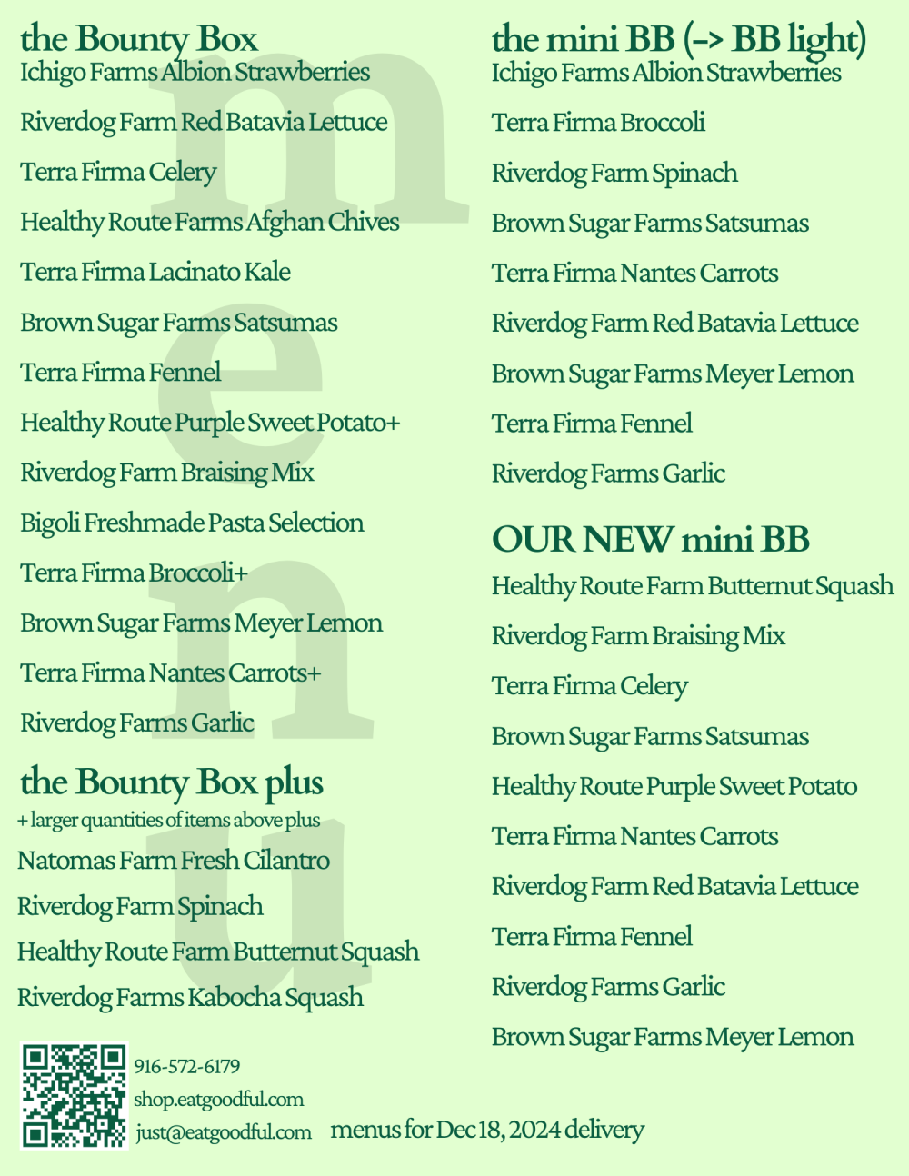 Delivery Schedule: as of February 2023, we’re delivering Bounty Boxes every other week. Our next delivery will happen on (approx) Wednesday, Dec 18th. If you select weekly deliveries, we will deliver biweekly but notify you as soon as we get back to the regular schedule. Please email or text us if we can provide any further info. We appreciate your understanding and patience.