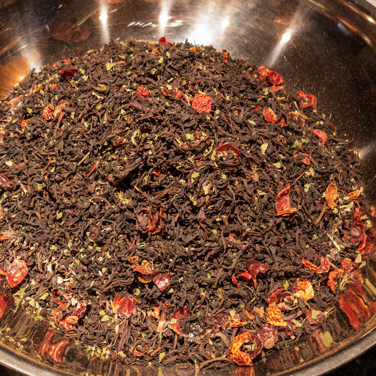 Black tea, Rosehip pieces, Blackberry leaves, Natural flavors (organic compliant).