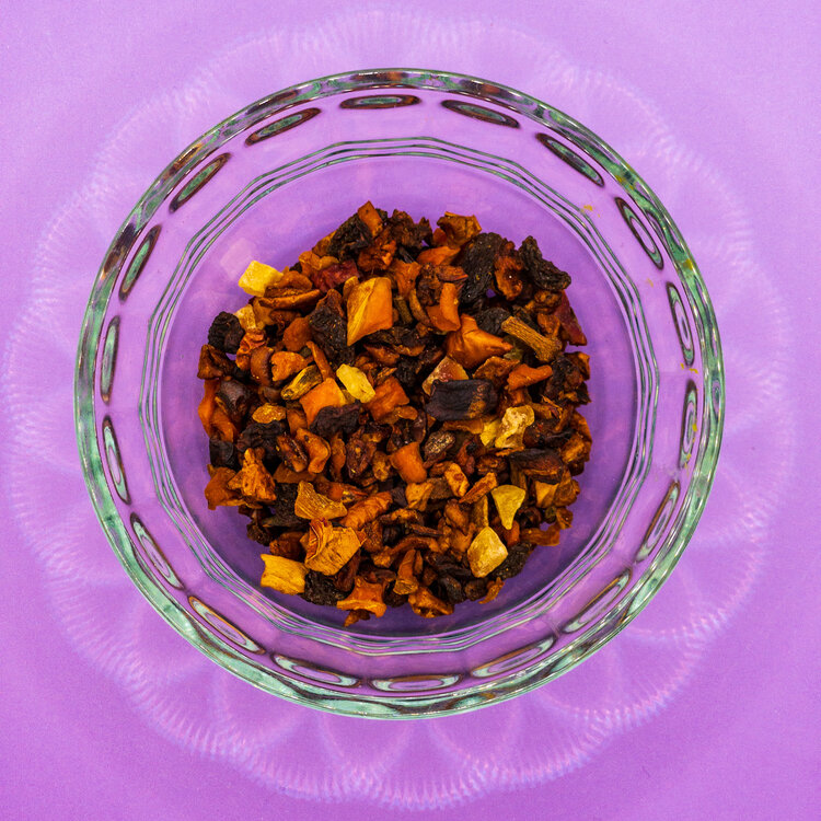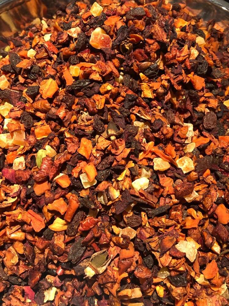 apple pieces (apple, acidifier: citric acid), raisins, candied papaya pieces (papaya, sugar), carrot pieces, beetroot pieces, flavor, pumpkin pieces, cardamom, cinnamon, cloves, rose petals.